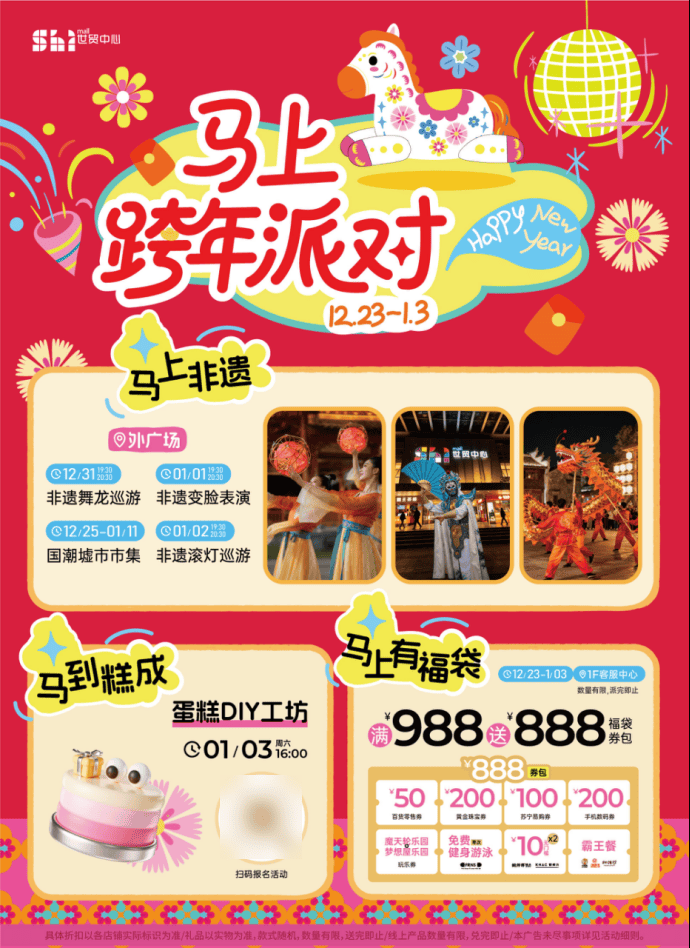 狂欢“策马”夜,摩登复古DISCO舞会点燃全场!还有超燃乐队表演,解锁跨年夜的狂欢模式。