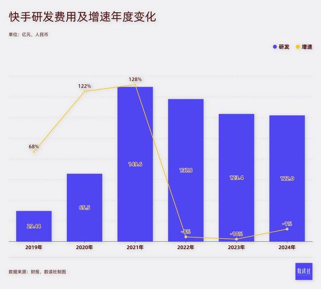 2024年,快手研发开支为123.4亿元,同比下滑1%,投入度已经连续三年下滑。在AI大发展的关键三年间,快手一直在压缩研发开支,这使得如今可灵AI在大模型的竞争中,几乎没有存在感。